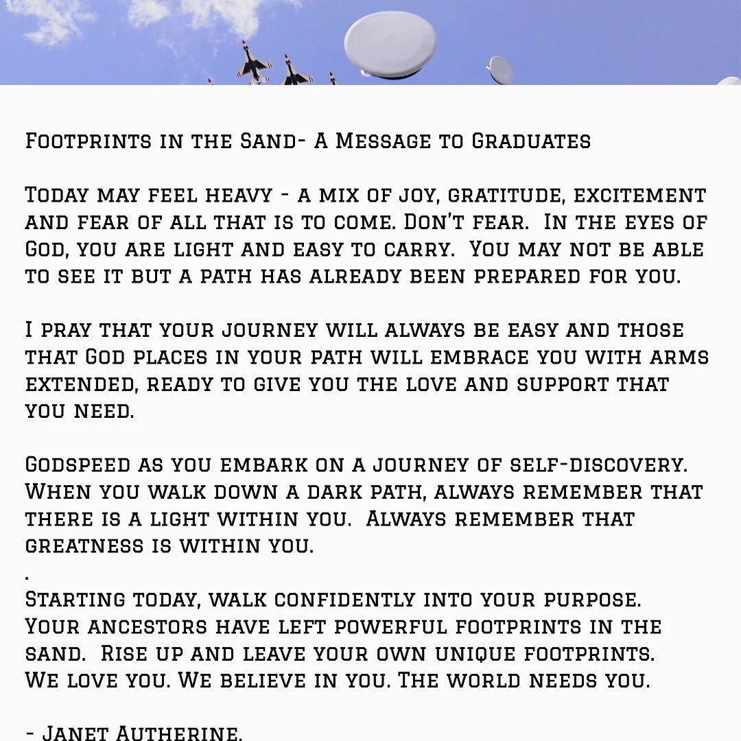 Godspeed as you embark on a journey of self-discovery. When you walk down a dark path, always remember that there is a light within you. Always remember that greatness is within you. Starting today, walk confidently into your purpose. Your ancestors have left powerful footprints in the sand. Rise up and leave your own unique footprints. We love you. We believe in you. The world needs you. - Janet Autherine
